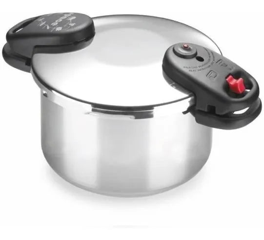 SPACE 4-liter super-fast pressure cooker, made of durable 18/10 stainless steel. It saves up to 70% on energy and cooking time. It features a triple safety system and a heat-diffuser sandwich base suitable for all types of cooktops, including induction. Its double-handle design optimizes kitchen space.
