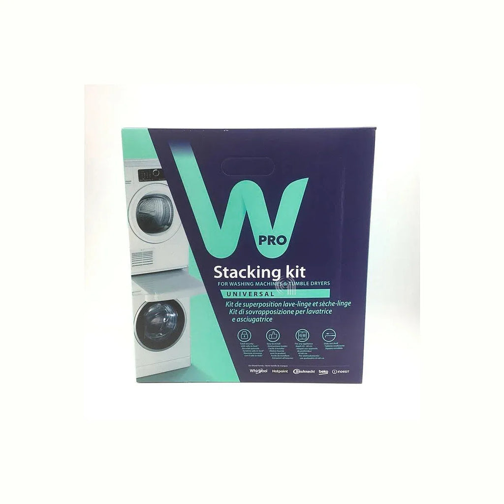 El kit de apilamiento SKS101 es un accesorio original diseñado para unir de forma segura una lavadora y una secadora, optimizando el espacio en tu hogar. Es compatible principalmente con secadoras y lavadoras de las marcas Whirlpool, Indesit y Bauknecht, garantizando una instalación estable y segura gracias a su sistema Safe-in-Lock®.
