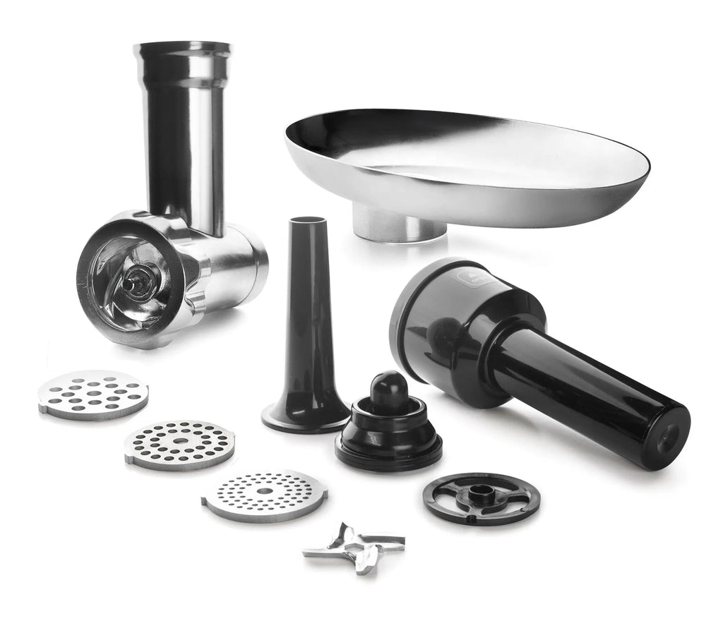 Accessories included: mincer, 4 interchangeable blades, stuffer and kibbe.
