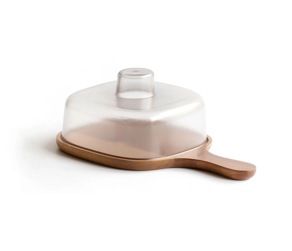 Cheese dish made of natural acacia wood base and BPA-free plastic lid.