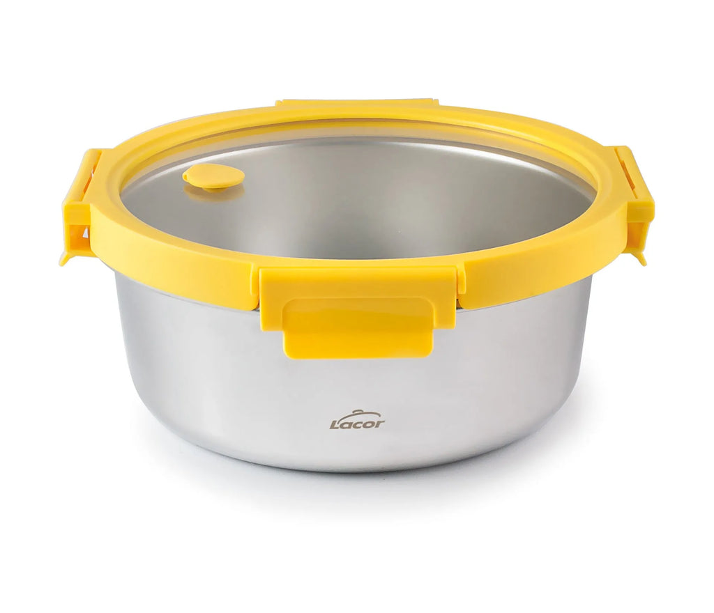 Microwave-safe 18/10 stainless steel container with glass lid and air valve.