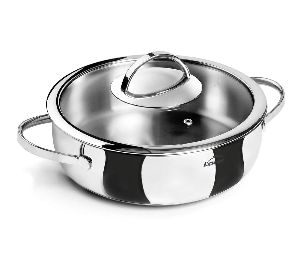 Includes shock-resistant glass lid with valve and 18/10 stainless steel rim.