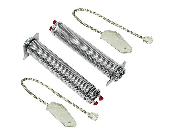 Kit de reparación de muelles de bisagra para puerta de lavavajillas. Incluye dos muelles y dos cuerdas (sirgas) con soporte. Proporciona tensión para la puerta del lavavajillas, evitando que caiga demasiado rápido al abrirse y ayudando a mantenerla cerrada. Reemplaza los números de pieza: 00751392, 00659339, 00627230, 00623540. Viene con una garantía de un año.