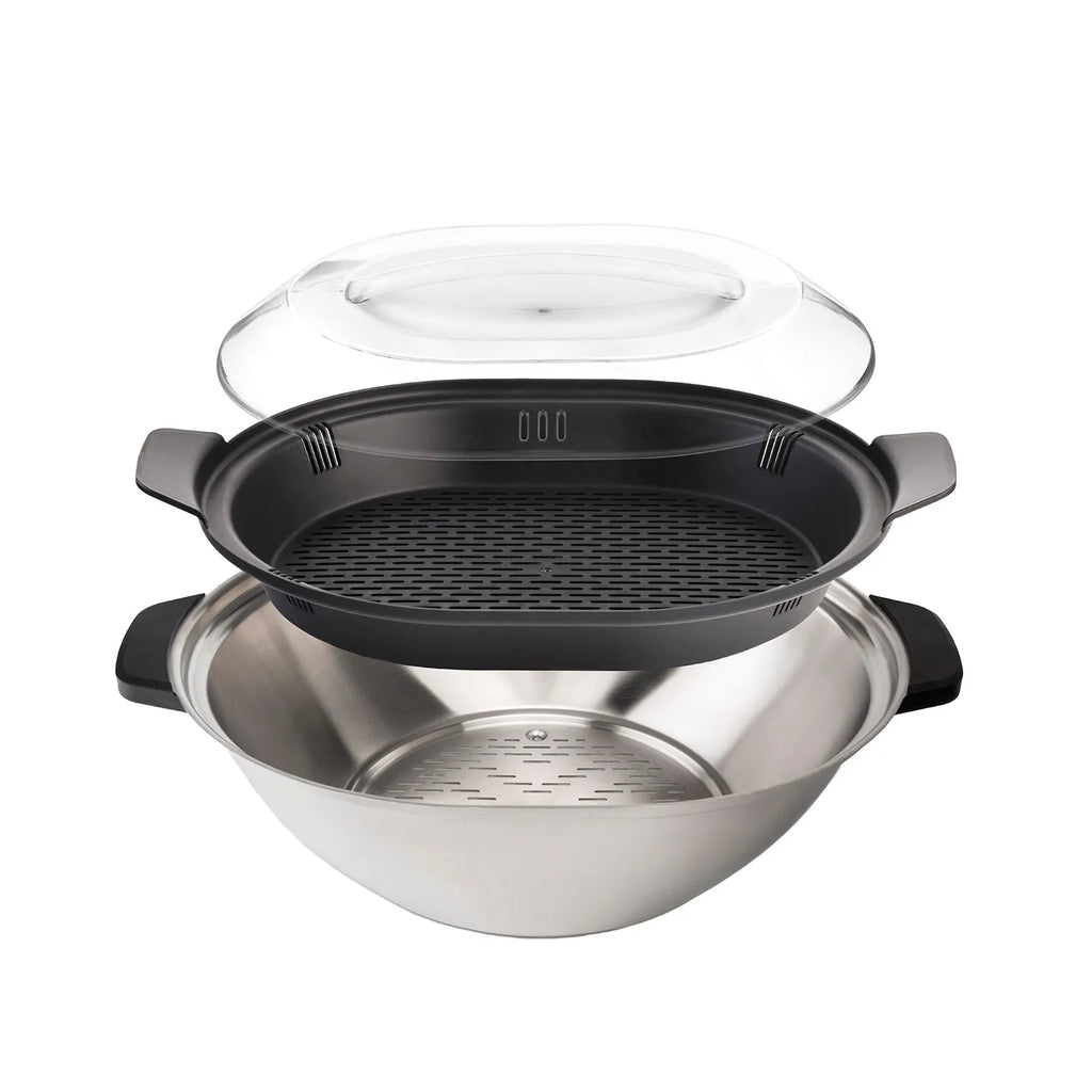Complete steamer set for Mycook Next: Includes a large stainless steel metal tray, a plastic tray and a transparent plastic lid with a handle for easy handling. Perfect for steaming and salt preparations. Maximum capacity of 5 liters. Certified BPA-free.