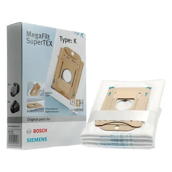Este recambio incluye un pack de 4 sacos de aspirador tipo K junto con un filtro micro-higiénico compatible con aspiradores Bosch y Siemens. Las bolsas están fabricadas en material sintético MegaAir SuperTEX, que garantiza la retención del 99% de partículas de tamaño entre 0,3 y 0,5 micras, mejorando la filtración y evitando la dispersión del polvo. El filtro micro-higiénico complementa el sistema de filtración para asegurar un aire más limpio durante la aspiración.