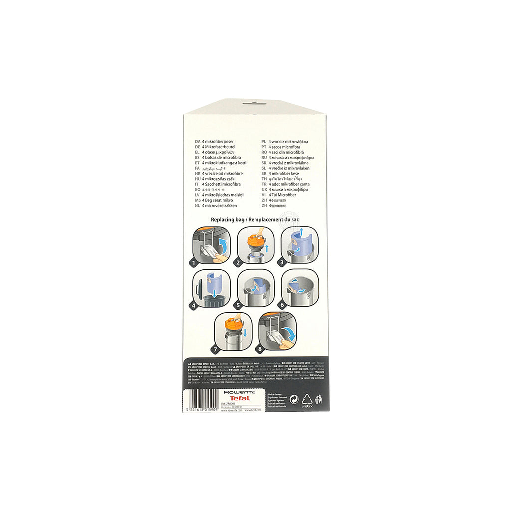 Este set incluye 4 bolsas originales para aspiradoras, diseñadas para modelos específicos de las marcas Rowenta, Moulinex y Tefal. Son recambios fundamentales para mantener la eficiencia de su aspiradora y garantizar una correcta recolección del polvo y suciedad.