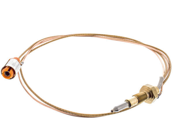 El termopar es un componente de seguridad esencial en cocinas de gas, que detecta la llama del quemador y permite el suministro de gas mientras esta se mantiene encendida. Este termopar coaxial de 550 mm de longitud está diseñado para asegurar que el gas solo fluya cuando la llama está activa, evitando fugas y riesgos de accidentes.